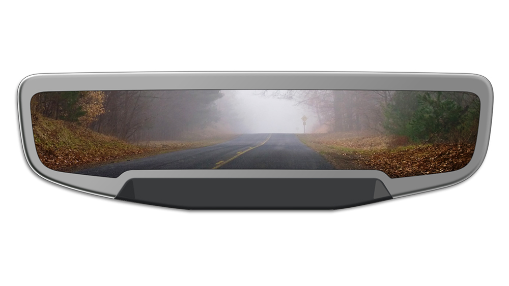 Ghosted vehicle driving along a road with fog and mountains in the foreground